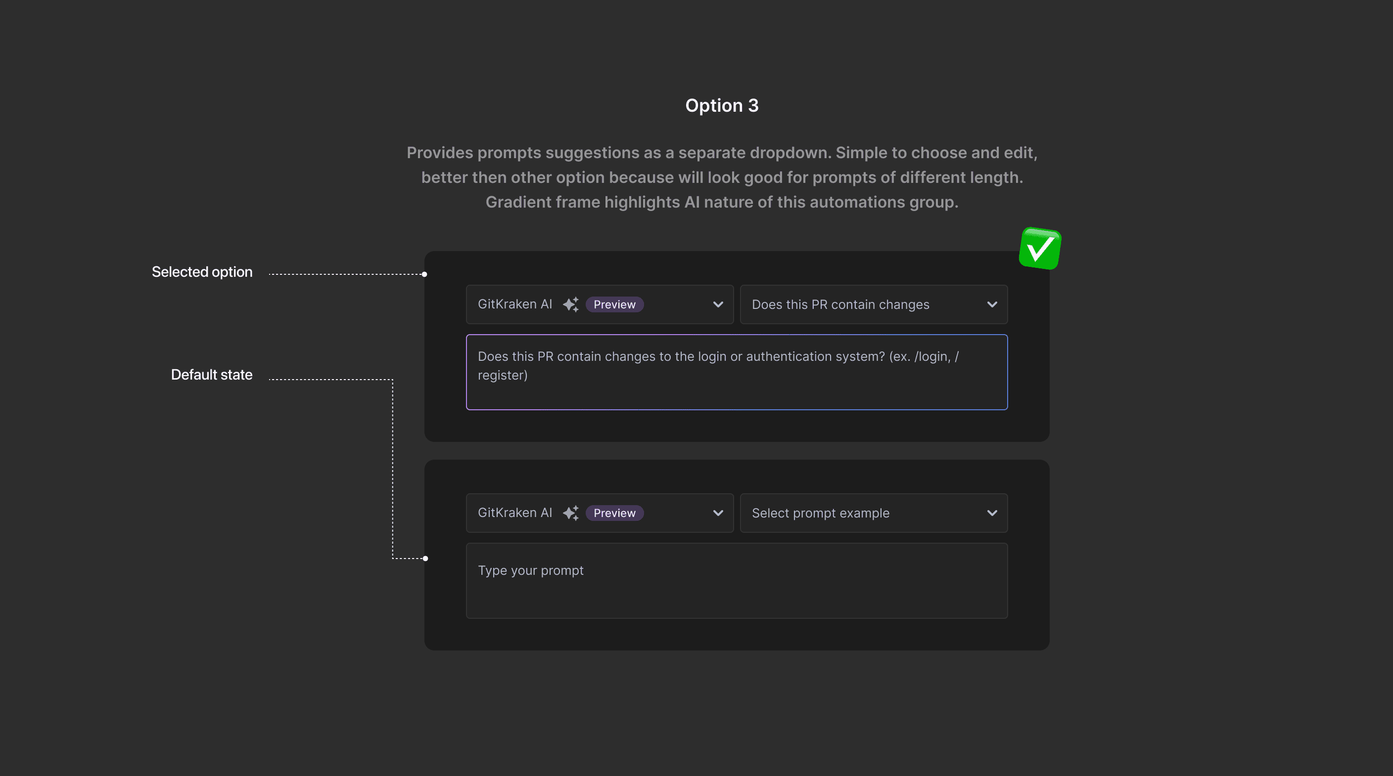 Another challenge I have to deal with was adding UI/UX updates to the AI automations which could create much more interesting flows (for example detecting possible complexity based on files addressed - auth flows, etc.) We covered several options including prompts of possible cases but landed on a more simple option with dropdown not to make the overall page too big. Also I highlighted the text field with gradient frame to show that this specific condition is AI based.