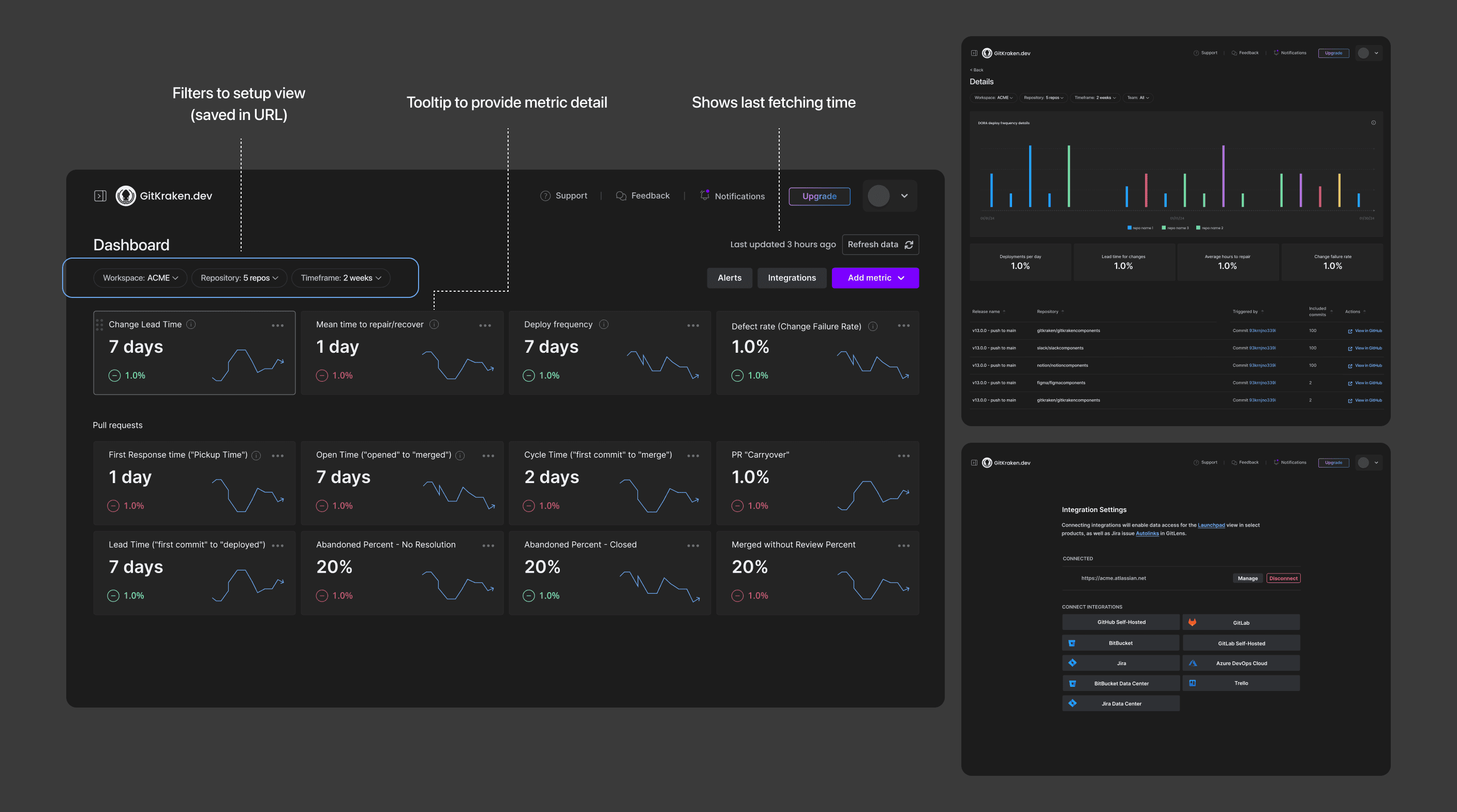 GitKraken has a partnership with software intelligence platform to be able to provide valuable DORA and other metrics to help development leaders to evaluate their decisions. We designed and built a flow for making this accessible for different teams - they can adjust and use it in many ways.