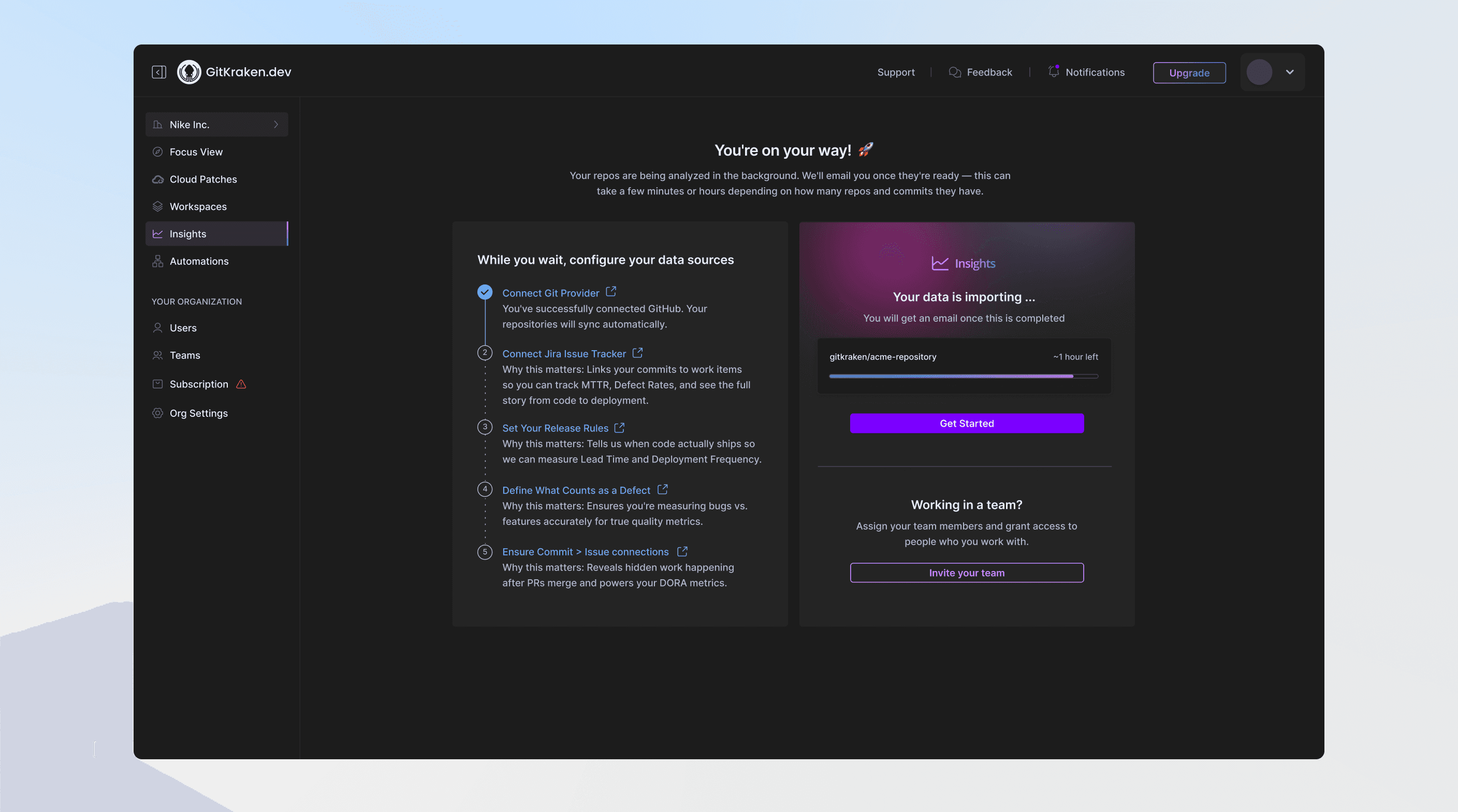 Onboarding was designed to ensure all critical data sources and rules are configured upfront while repositories are being fetched. By guiding users through connecting repositories, defining release rules, and aligning issue tracking early, the system establishes a reliable data foundation from day one. This approach reduces setup friction, prevents incomplete or misleading metrics, and allows teams to start exploring Insights as soon as data ingestion is complete.