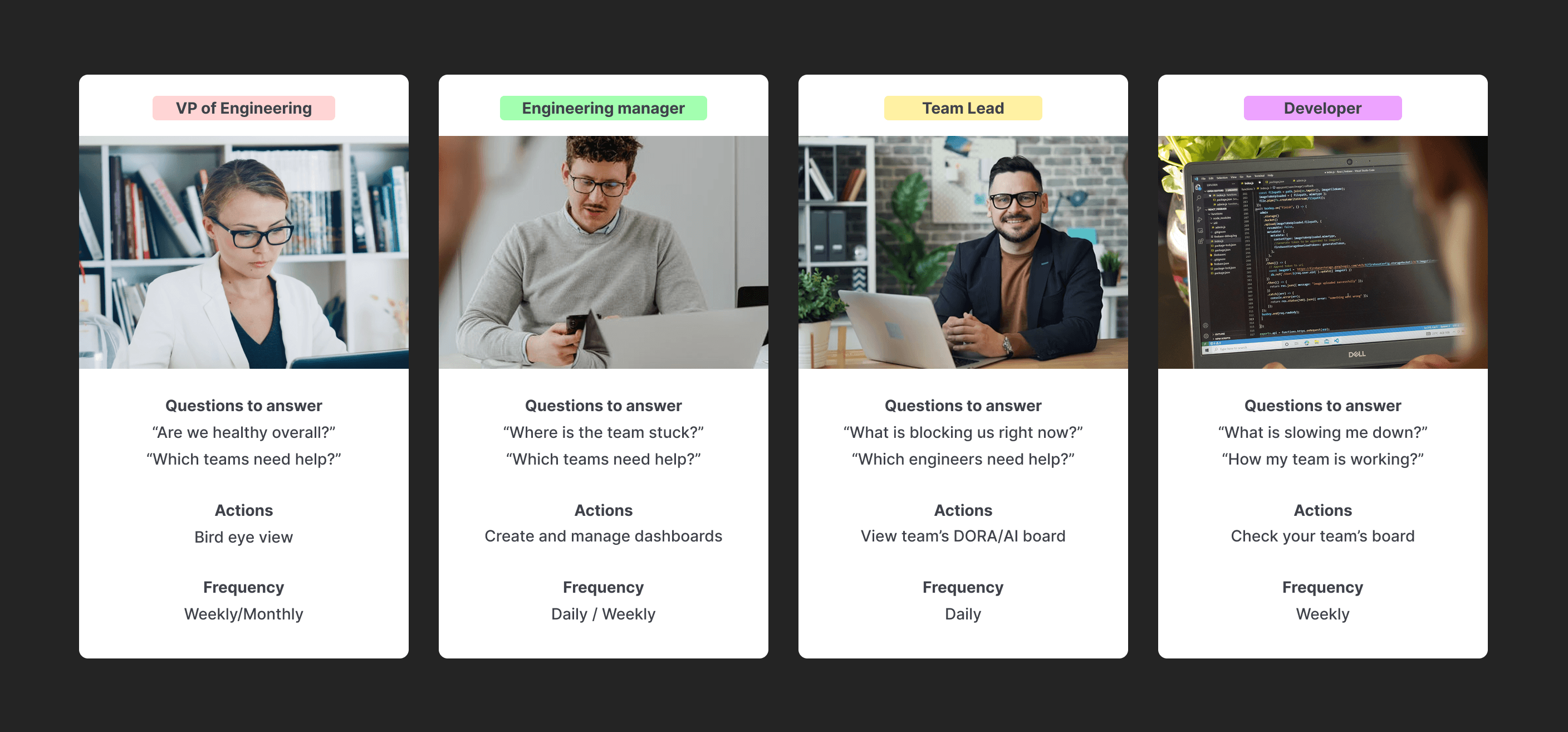 AI metrics and AI-generated summaries function as decision accelerators, not as additional layers of abstraction. AI metrics translate complex, low-level engineering signals such as PR flow, review latency, CI reliability, or context switching into interpretable indicators that reveal trends, anomalies, and risk patterns over time. AI summaries then synthesize these signals into concise, role-aware narratives that explain what changed, why it matters, and where attention is needed, removing the need for manual analysis.