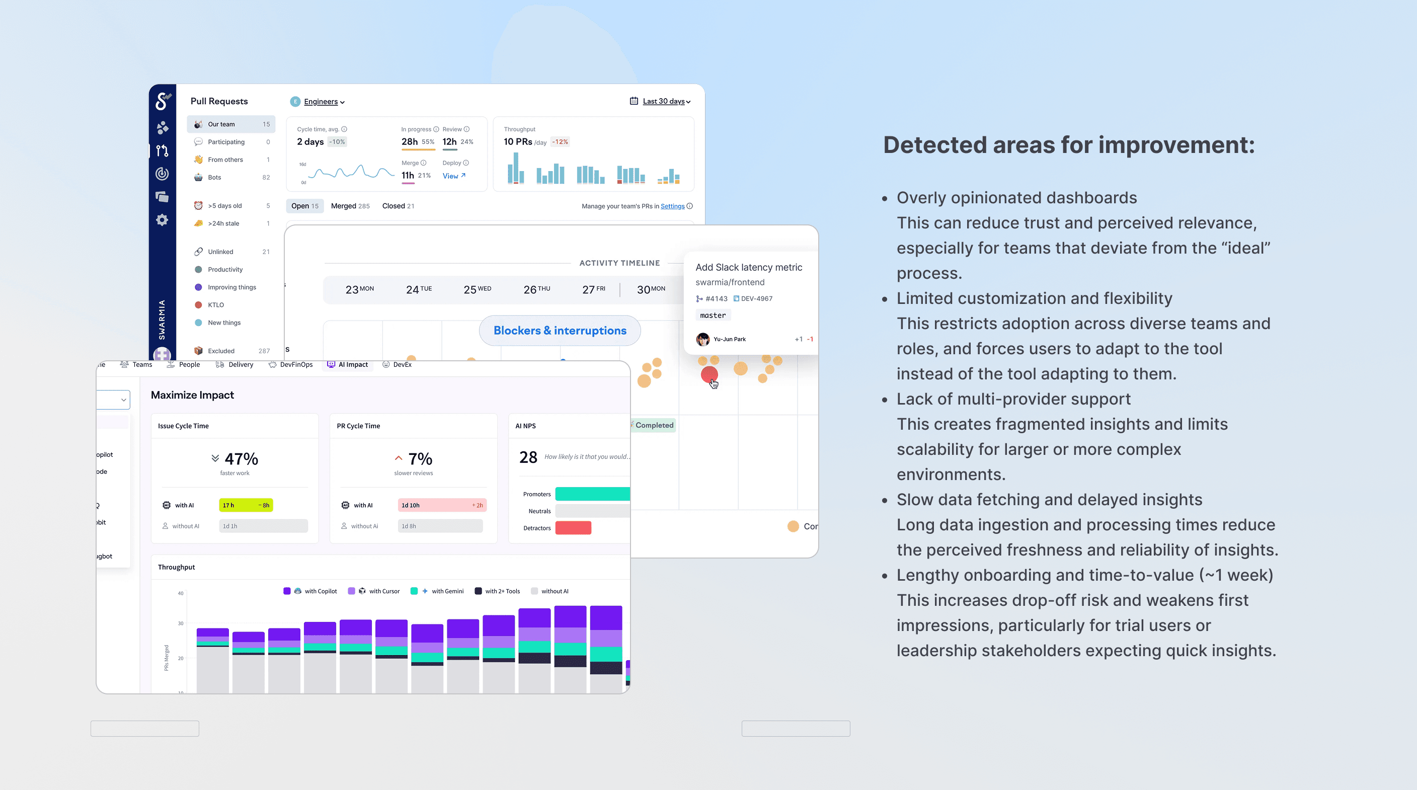 The project was grounded in extensive qualitative research, including multiple interviews with engineering managers, tech leads, and product stakeholders. The research team revealed that while teams use a wide range of analytics and delivery tools, these solutions lack flexibility: they offer rigid, predefined dashboards, make it difficult to create views tailored to different teams or goals, and provide limited visibility into emerging workflows such as AI-assisted development. As a result, teams struggle to adapt metrics to their context and cannot reliably track how AI tools are actually used and where they create value.